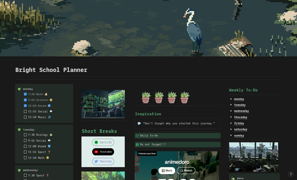 The Bright School Planner is not just a tool; it's a celebration of productivity and inspiration. Seamlessly integrated with Notion, this planner transforms your academic routine into a dynamic and visually stimulating adventure. Dive into a world of lively organization that mirrors the vibrancy of your aspirations.